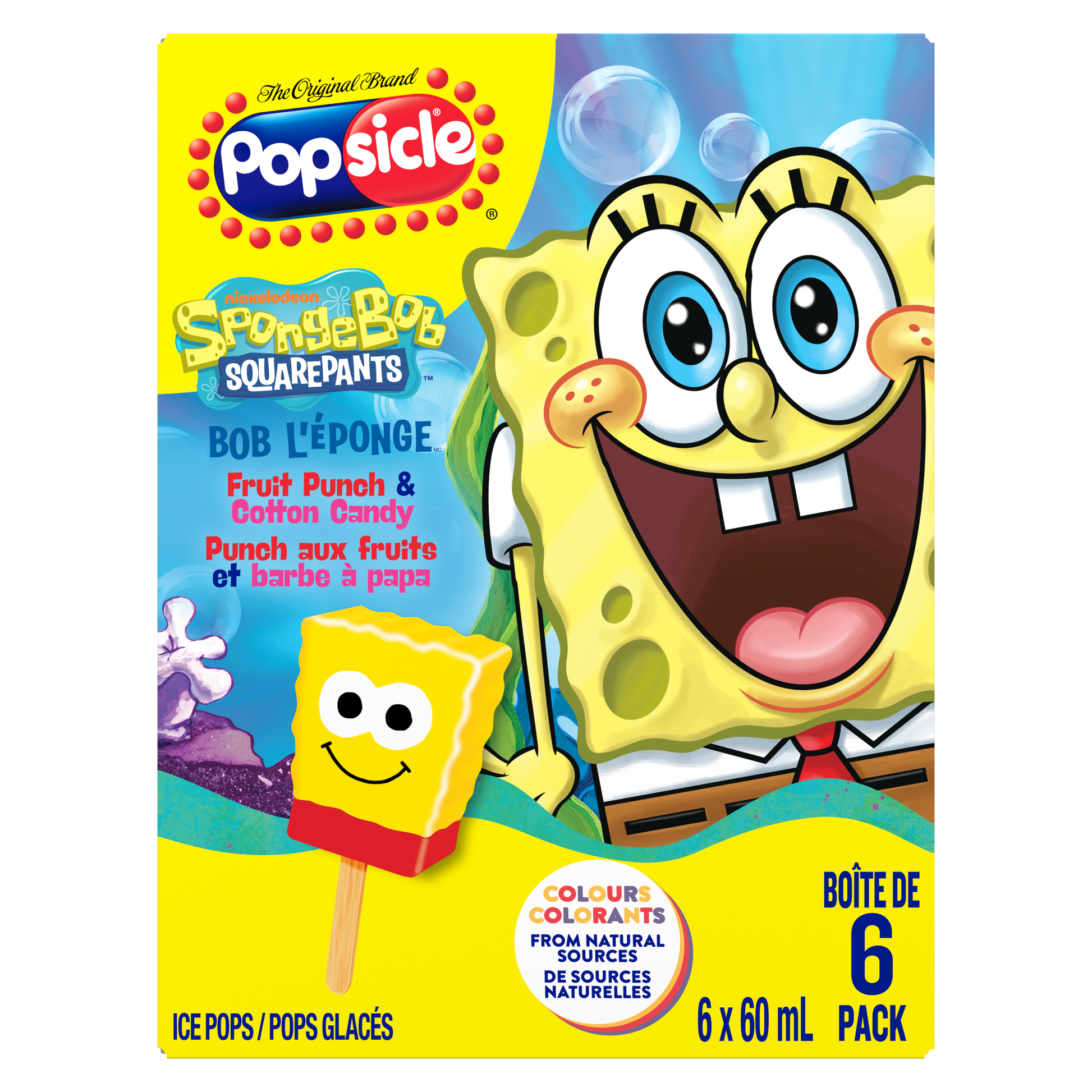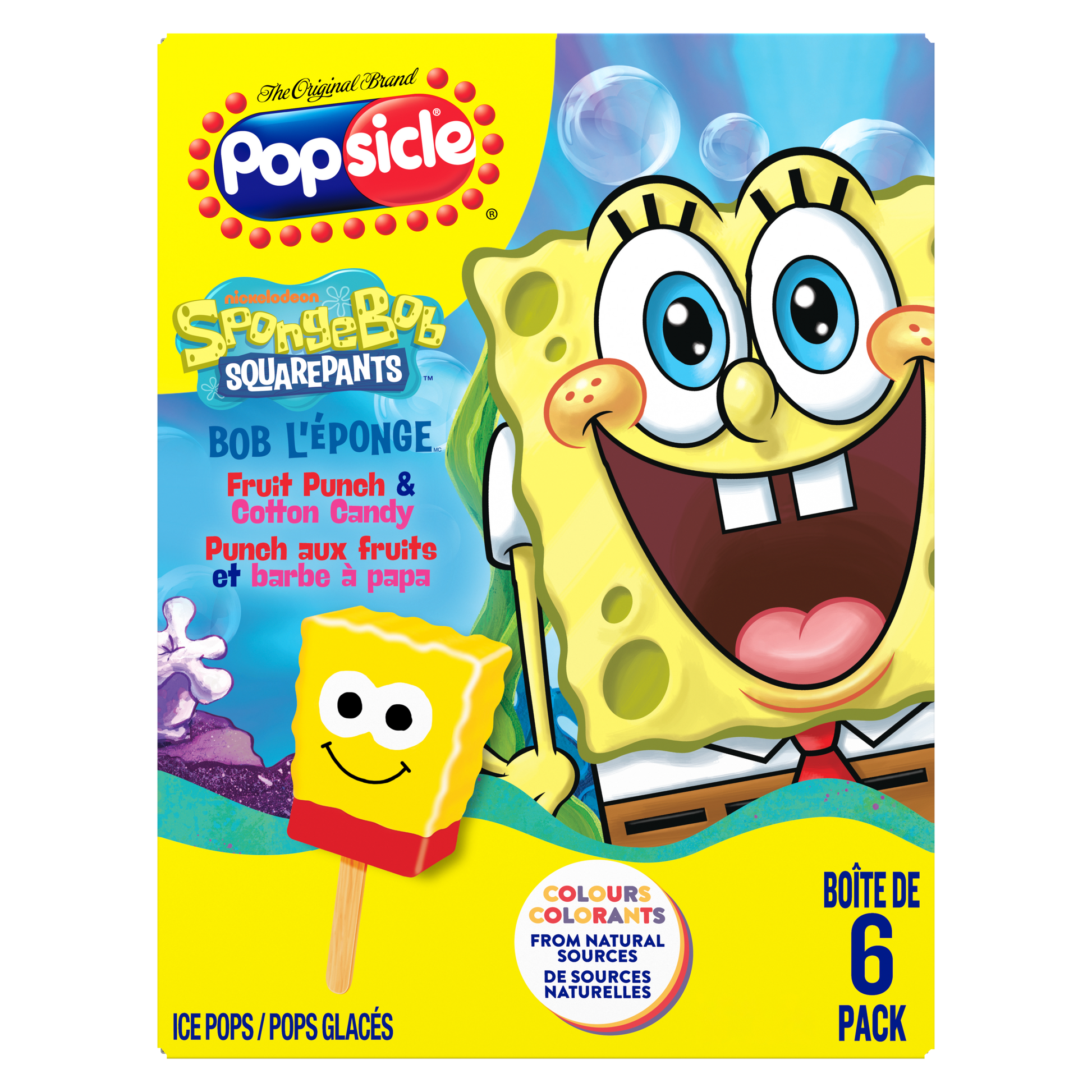 - Popsicle SpongeBob Squarepants ice pops are made with a classic combo of Fruit Punch & Cotton Candy.